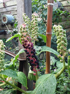 Eindelijk begint de karmozijn bes kleur te krijgen. Als alle besjes donker zijn dan wil ik op verschillende manieren vilt en stof verven.