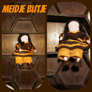 Ik ben de afgelopen week druk geweest met het maken van het popje " Meisje bijtje". Eigenlijk moest zij gemaakt worden van zwart/geel velours maar dat kon ik niet vinden. Vandaar dat ik bruin vilt heb hernemen en er strookjes geel/oranje streepjes op gemaakt heb. Ik heb ze vastgemaakt door ze met naald en draad aan elkaar te maken. Achteraf denk ik dat plakken met lijm mooier zou zijn geworden.