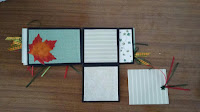 Op enkele pagina`s heb ik een "herfstblad"geplakt. Deze geven net iets kleur aan het boekje. Op de lange pagina`s en tags kunnen in totaal 15 grote foto`s. En op de andere pagina`s en tags 15 kleine foto`s.
