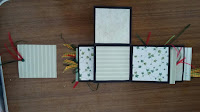Een pagina bestaat uit twee zwarte kaartjes op elkaar geplakt en een flap die je open kun vouwen. De pagina heb ik een korte zijkant los gelaten . Hierin zitten de tags. Dat zijn losse kaartjes waarop geschreven kan worden of foto`s opgeplakt kunnen worden.