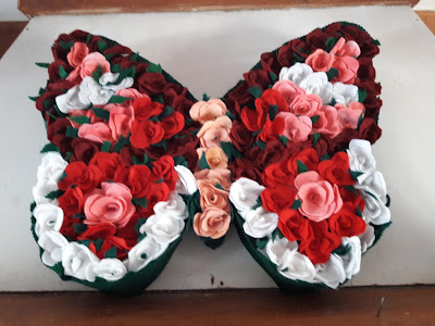 Op advies van de begrafenisondernemer nam ik de vlinder mee om hem te drogen. Helaas mislukte dat. Alle rozen verrotten. Toen kwam ik op het idee om hem te vullen met rozen van vilt.
